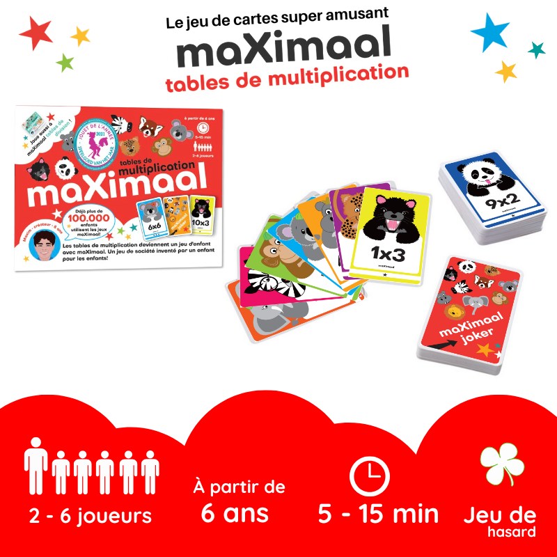 « Bonjour, je m'appelle Maxim (8 ans) ! J'ai inventé 2 jeux de société pour apprendre plus facilement les tables de multiplication et division tout en s'amusant : maXimaal! Tu peux y jouer à la maison, pendant les vacances et à l’école !»